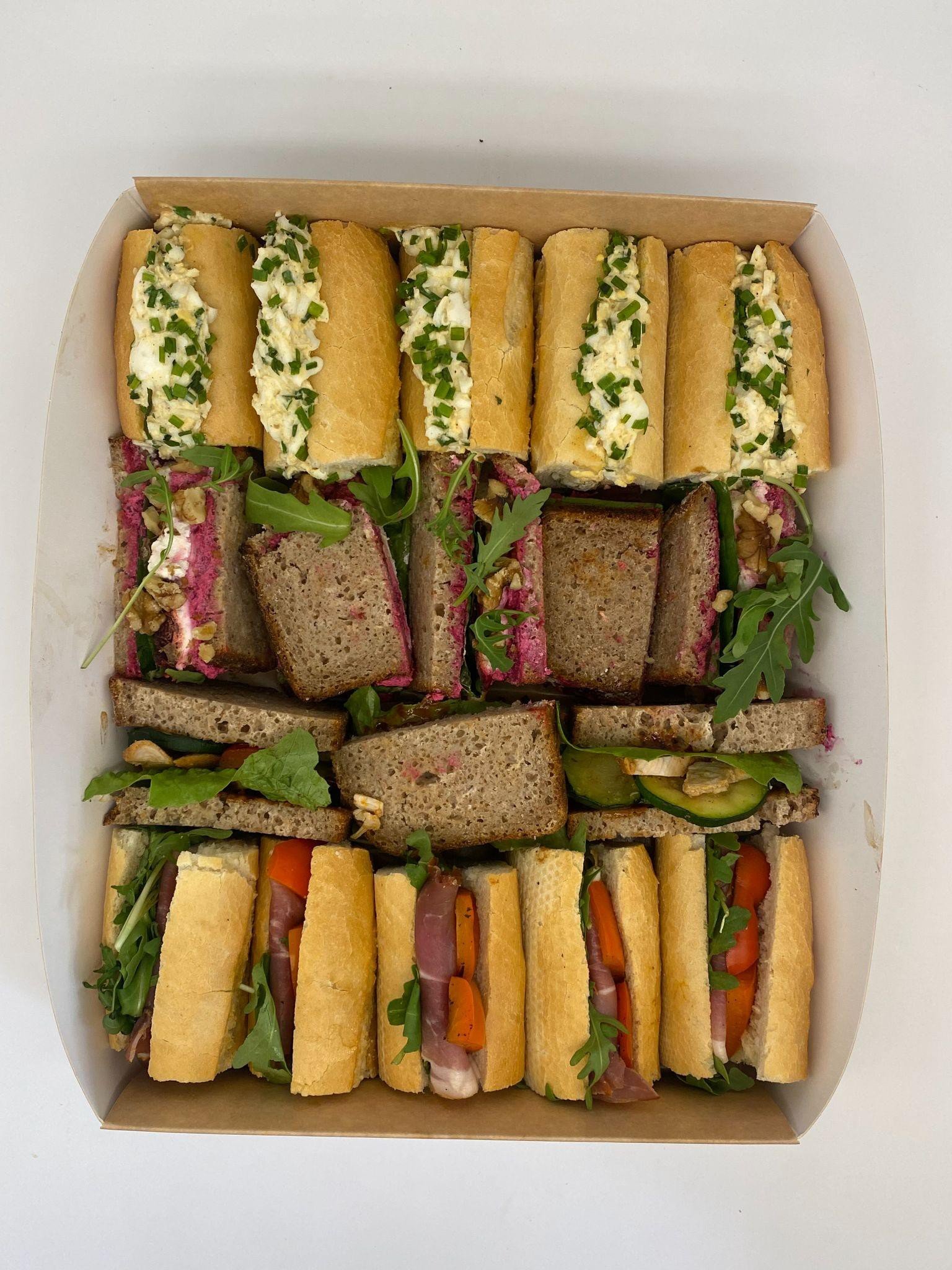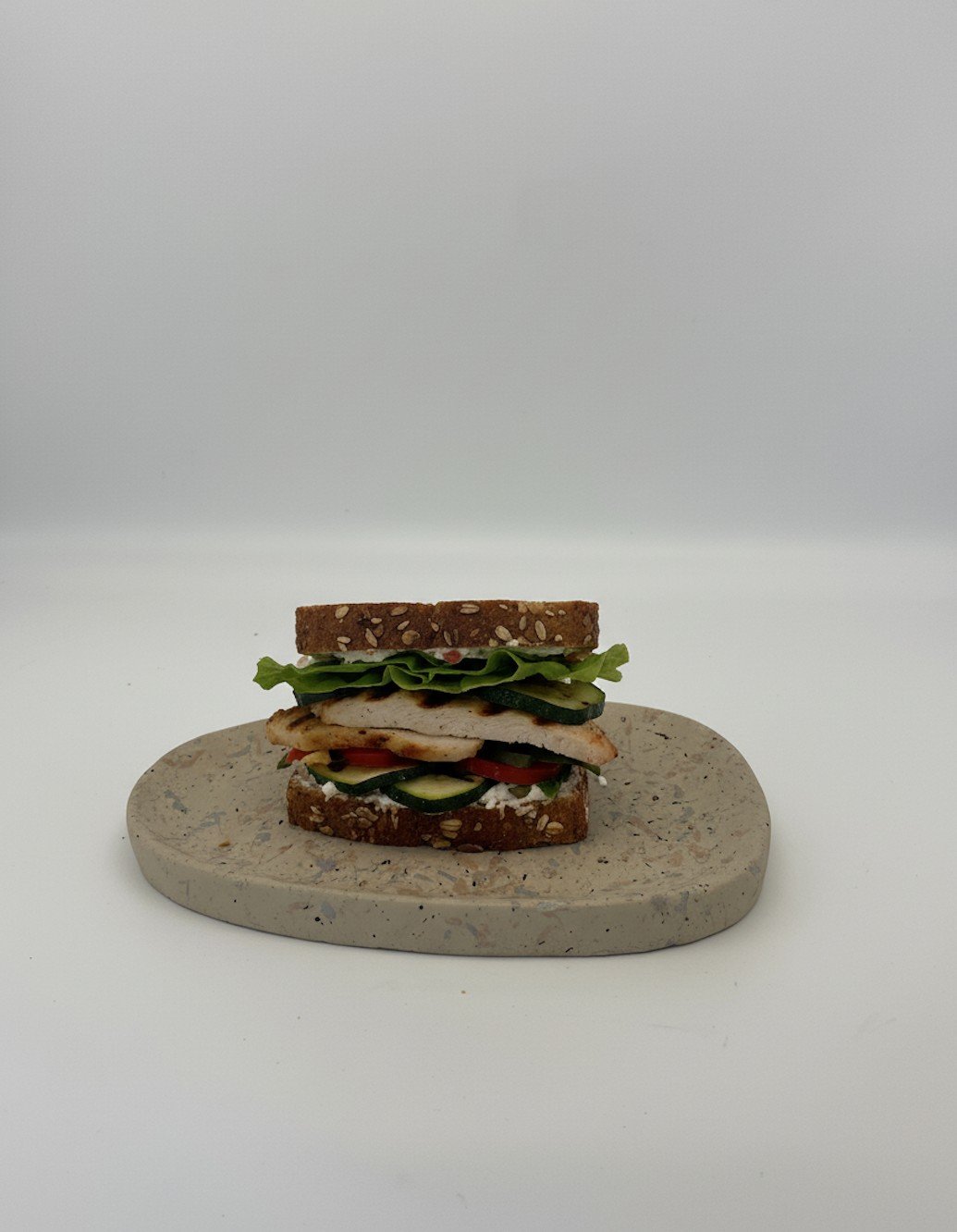 Mini sandwich na ciemnym pieczywie z kurczakiem i warzywami grilowanymi