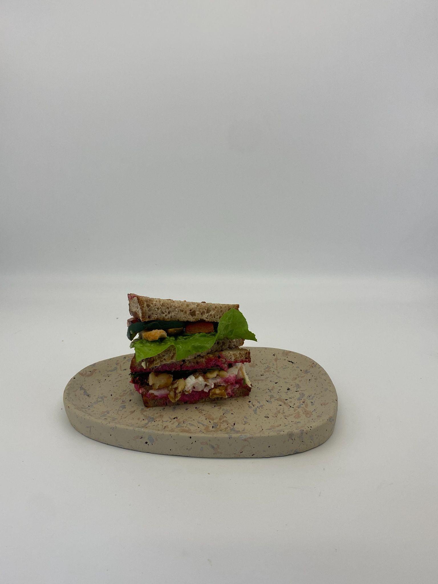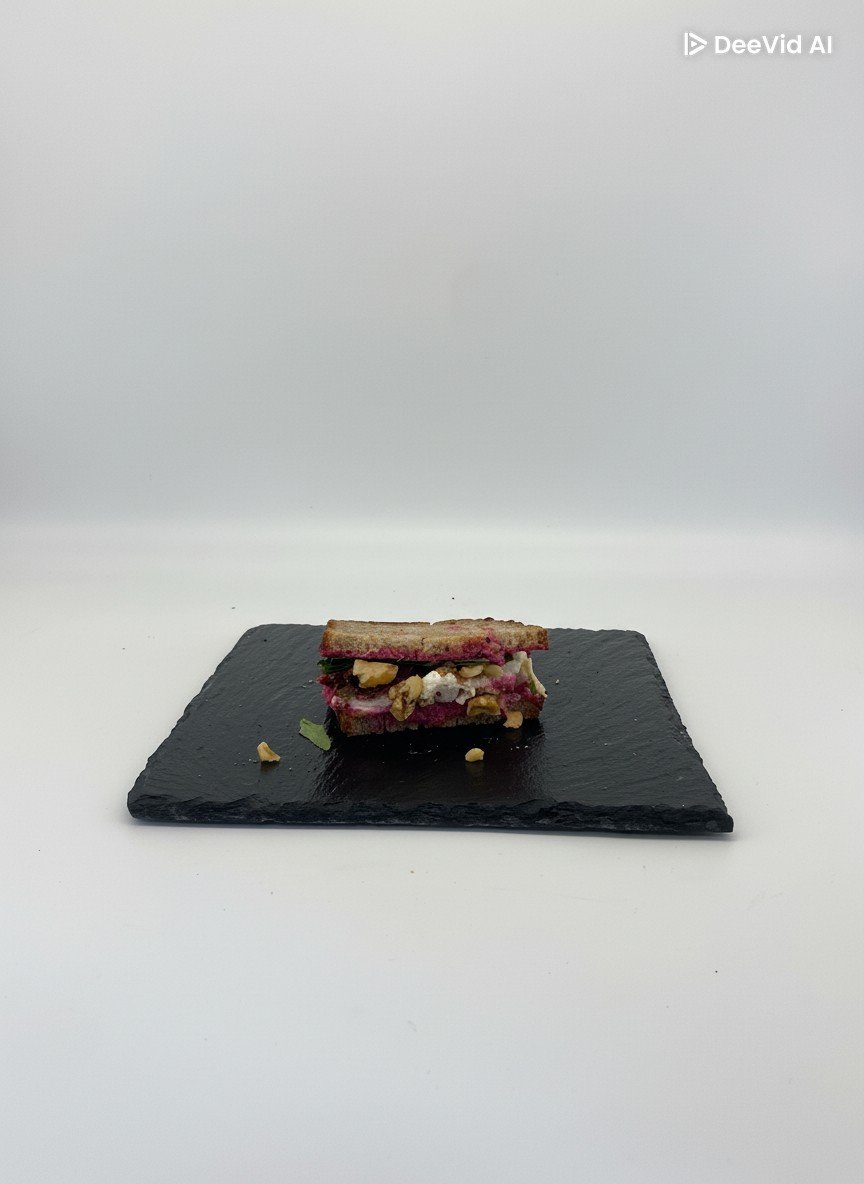 Mini sandwich na ciemnym pieczywie z kozim serem i burakiem
