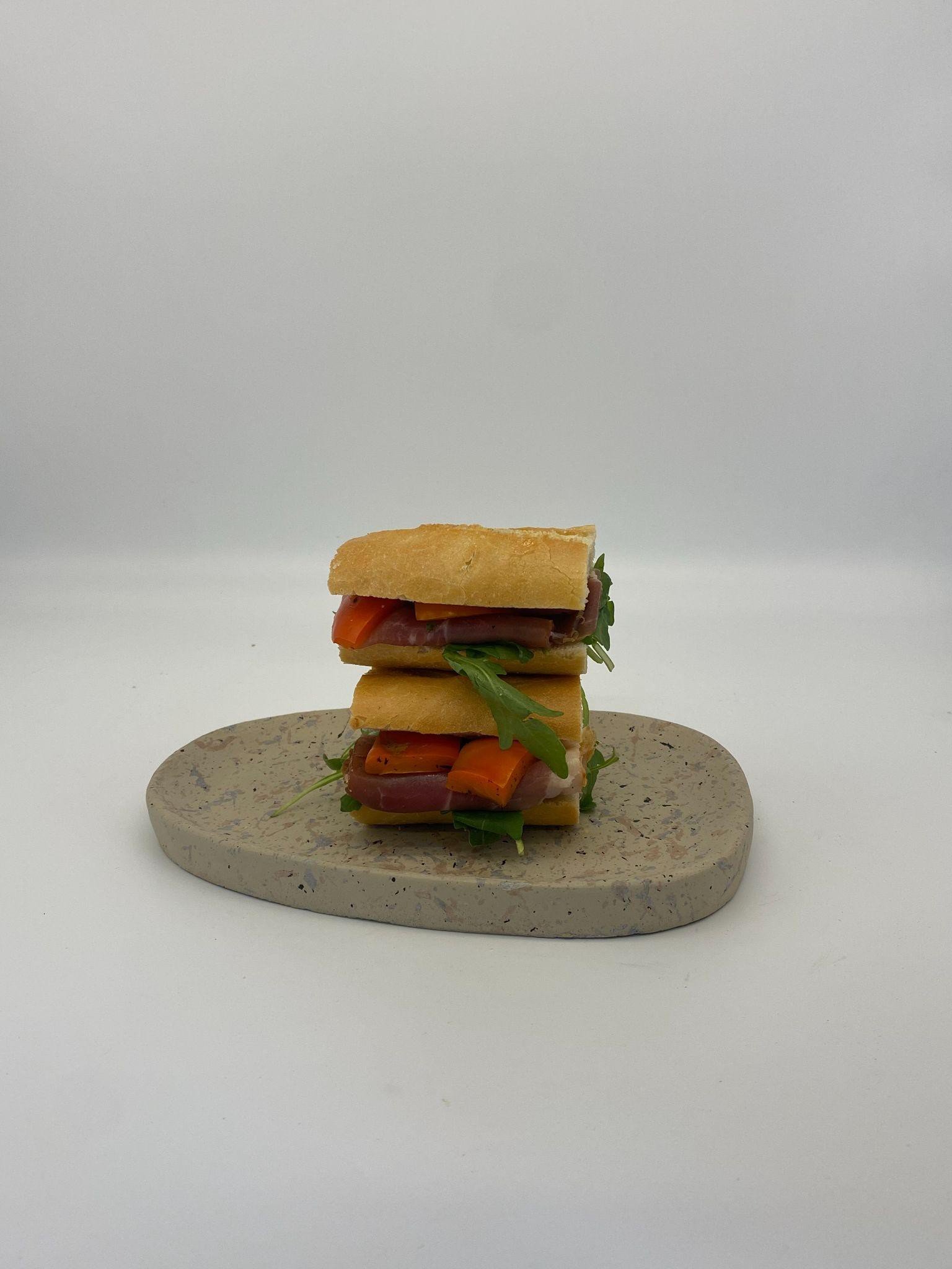 Mini sandwich na bagietce z szynką dojrzewającą, pieczoną papryką i oliwą truflową